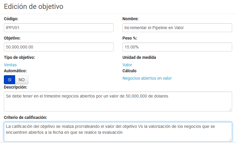En el campo Criterio de Calificación, describa cual es el criterio de calificación del objetivo que está definiendo de tal manera que al Calificar el objetivo tanto el supervisor como el asesor comercial no presenten dudas sobre la nota. Por ejemplo si el objetivo consiste en incrementar el pipeline con 5 negocios durante un trimestre. Acá se puede explicar que si el asesor comercial logra los 5 negocios la Nota es de 3 o si logra los 5 negocios la nota es de 5. Ahora si la nota es 3 y logro 5 negocios, que pasa si sobre pasa el objetivo, como se calcularía este logro.