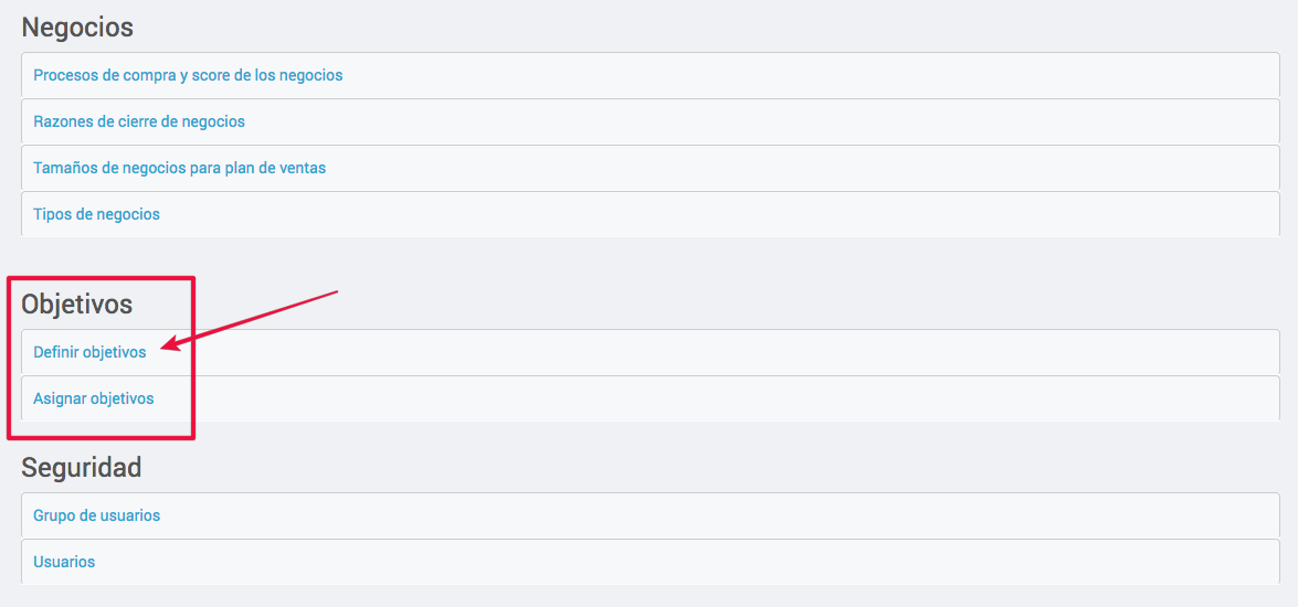 De esta forma usted puede establecer los Tipos de Objetivos que asignará a cada uno de los miembros de su equipo comercial.