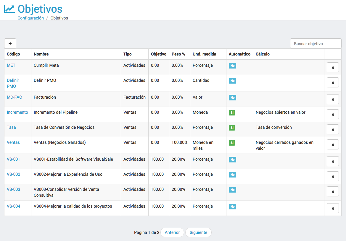 El módulo de Objetivos se utiliza para gestionar los objetivos definidos a los usuarios de VisualSale. Los objetivos pueden ser de diverso tipo y su cumplimiento se puede controlar de forma automática (con base en la información registrada en VisualSale, el sistema lleva un control automático del avance) o de forma manual (no hay información dentro de VisualSale para poder llevar el control, se debe registrar manualmente el avance del objetivo). La gestión incluye su definición, seguimiento y calificación a través de revisiones periódicas, de tal manera que permita evaluar su desempeño. En esta opción del módulo en particular se realiza la definición de los objetivos y en la siguiente opción que se explicara más adelante se Asignaran los objetivos a los usuarios.