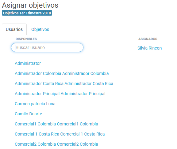 - En la columna de Disponibles se muestran todos los usuarios a los cuales aún no se le han definido objetivos para el conjunto de periodos seleccionado.
