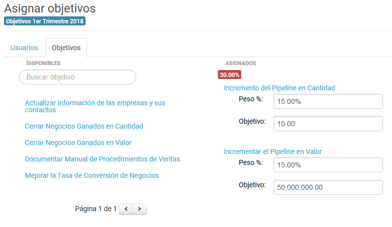 De esta forma usted puede realizar la Asignación de Objetivos a cada uno de los miembros del equipo comercial. Una vez asignados los objetivos, se puede proceder a llevar a cabo las revisiones del cumplimiento de los objetivos.