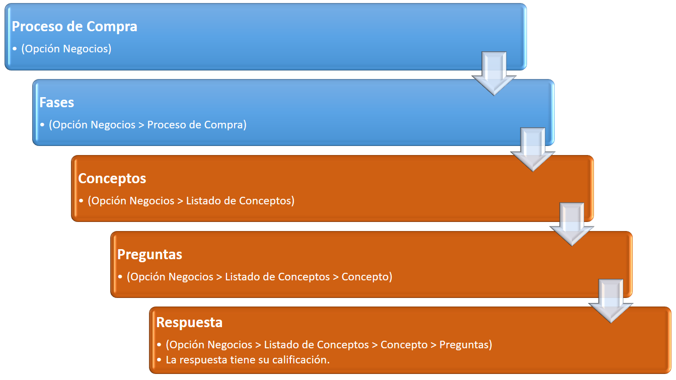 En esta grafica se visualiza como se encuentra estructurado un Proceso de Compra. De acuerdo con lo anterior, para armar el proceso de compra se deben definir primero los conceptos, y para crear los conceptos cada uno de ellos debe tener una pregunta o varias y una respuesta o varias y cada respuesta debe tener una calificación. Lo que se encuentra en color cafe, se crea en la opción Listado de Conceptos.