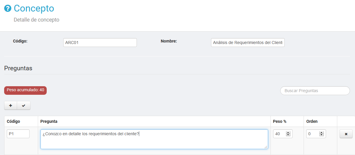 - En el campo Peso, corresponde al peso relativo de la pregunta. La sumatoria de los pesos de las preguntas, debe sumar 100%.