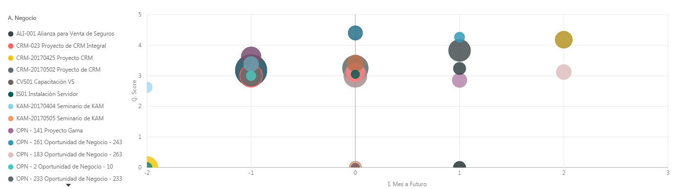 El eje de la X corresponde a los meses. El mes actual corresponde al mes cero, el siguiente mes corresponde al mes uno, etc. Por ejemplo si nos encontramos en el mes de agosto este será el mes 0, y el siguiente mes que corresponde a septiembre corresponde al mes 1. Ahora si existen negocios con fechas estimadas de cierre vencidas, entonces los valores de los meses van disminuyendo, por ejemplo si se tienen negocios con fecha de vencimiento en julio, corresponde al mes -1 y así sucesivamente.