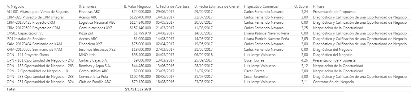 En el campo Tasa Exitosa, se visualiza Si o No. Si, indica que se pudo llevar a cabo la conversión de moneda y No que no se pudo llevar a cabo. Si no se llevó a cabo la conversión el valor del negocio se muestra en cero. Para mayor información sobre la tasa de conversión consulte el siguiente link. Acá la conversión se presenta cuando los negocios por ejemplo se manejan en Pesos y en el tablero de Power BI maneja su moneda base en dólares, en ese momento la Tasa Exitosa indica Si, al llevar a cabo la conversión y los valores de los negocios pasan de Pesos a Dólares. La moneda en la cual se maneja el tablero de Power BI, la define el cliente durante el proceso de implementación.