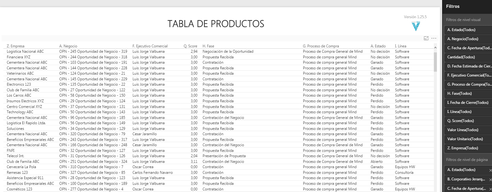 La tabla de productos cumple con el objetivo de listar todos los negocios que tiene la empresa discriminados por línea de producto. Ayuda a la validación de información sin tener que ingresar a VisualSale.