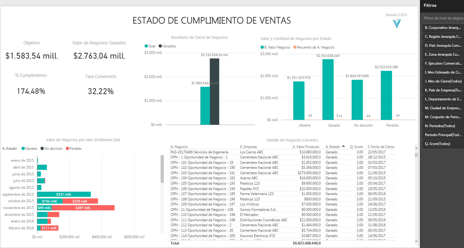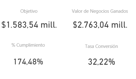 - Objetivo, valor de negocios ganados, % de cumplimiento, tasa de conversión.