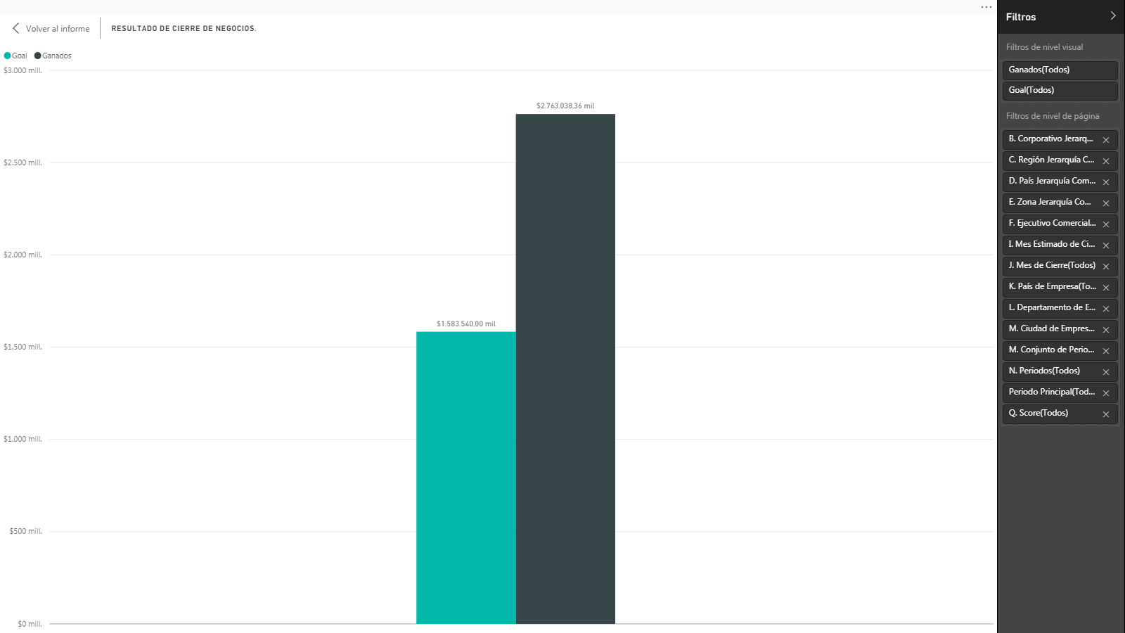 - El grafico por defecto muestra todos los negocios ganados y todos los valores del objetivo "Negocios Cerrados Ganados en Valor" en todos los periodos de tiempo existentes en el sistema.