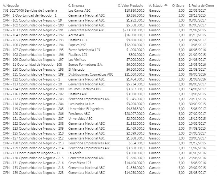 En el campo Estado, se visualiza el estado del negocio, los cuales pueden ser Ganado, Abierto, No Decisión y Perdido.