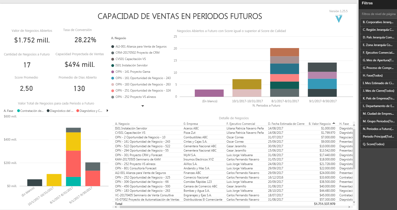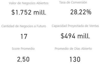 - Indicadores: valor de negocios abiertos, tasa de conversión, cantidad de negocios a futuro, capacidad proyectada de ventas, score promedio, promedio de días abierto.