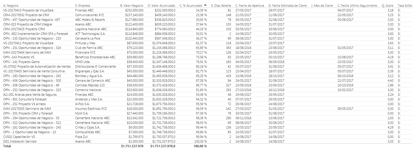 - Los negocios están organizados de mayor a menor, de acuerdo con el valor del negocio.