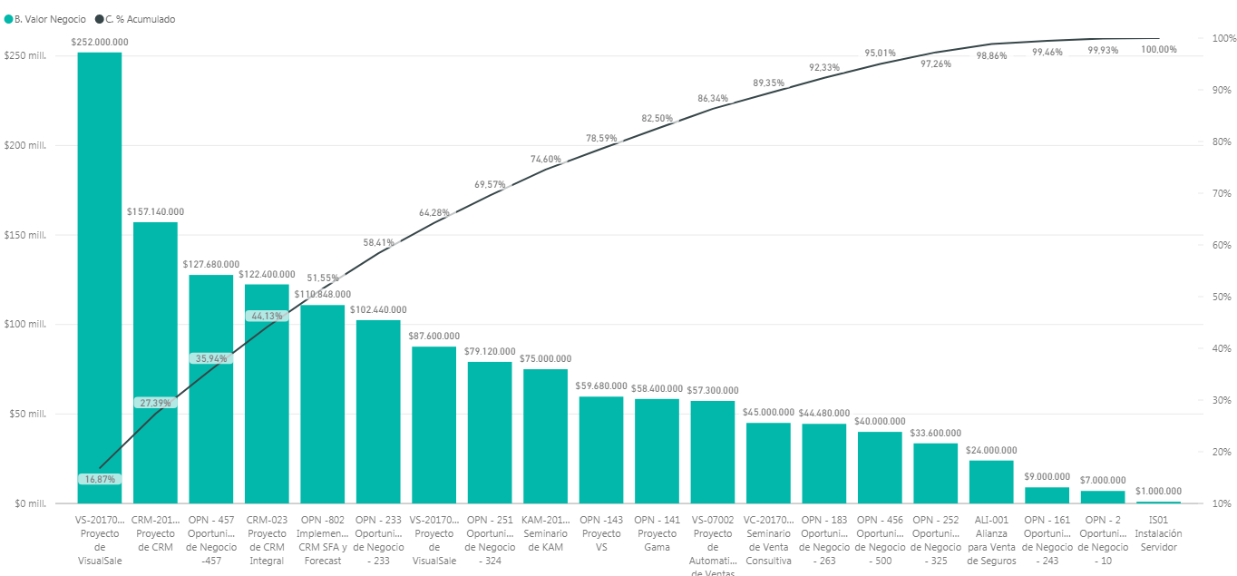 El objetivo de este diagrama Pareto es determinar cuáles negocios cubren el 80% de las ventas en la compañía. En este ejemplo, 13 negocios cubren el 80%. Acá se debe dar prioridad al cierre del primer negocio el cual tiene un porcentaje de 16.87% sobre los 20 negocios y a los demás que brindan un aporte alto al cumplimiento del objetivo de ventas.