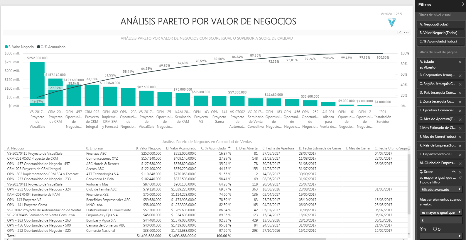 El objetivo de la página Capacidad de Pareto es visualizar los negocios abiertos que tienen un valor y score de buena calidad y que sumados pesan el 80% del pipeline de la compañía. De esta forma los usuarios visualizan rápidamente en cuales negocios se deben centrar para realizar el cierre. También se tiene en cuenta el filtro de los negocios con score igual o superior a 3 en este ejemplo, es decir negocios de buena calidad. La página tiene dos componentes: