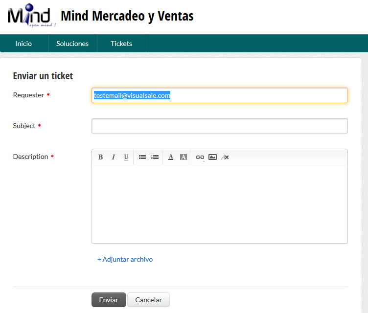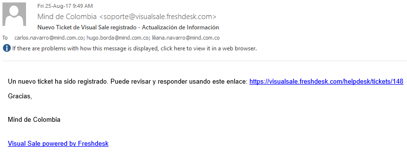 - A través de un correo electrónico. Por ejemplo soporte@visualsale.freshdesk.com. Este correo se define cuando se realice la configuración de FreshDesk.