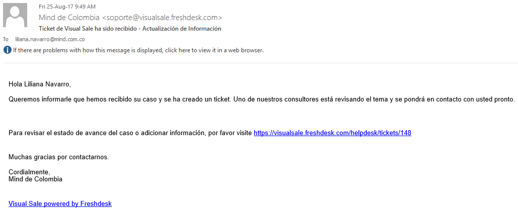Acá el usuario que reporto el caso recibe esta notificación en donde se le informa que el caso fue recibido y que el área de soporte esta trabajando para darle una respuesta y/o solución.