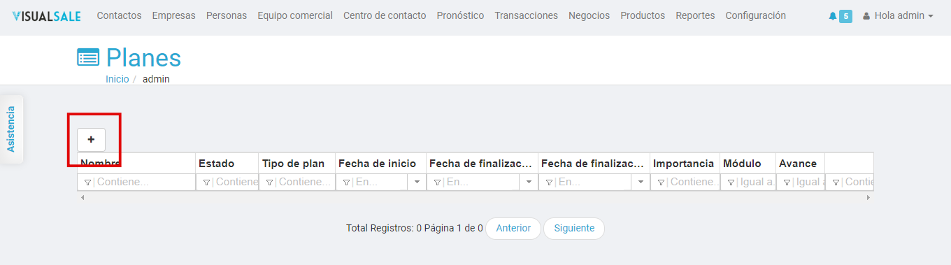 Seleccionada esta opción, usted verá una pantalla en la cual se visualizarán los Planes existentes. En esta pantalla usted puede dar clic en el botón de + para crear un nuevo Plan, tal como se ilustra en la siguiente imagen: