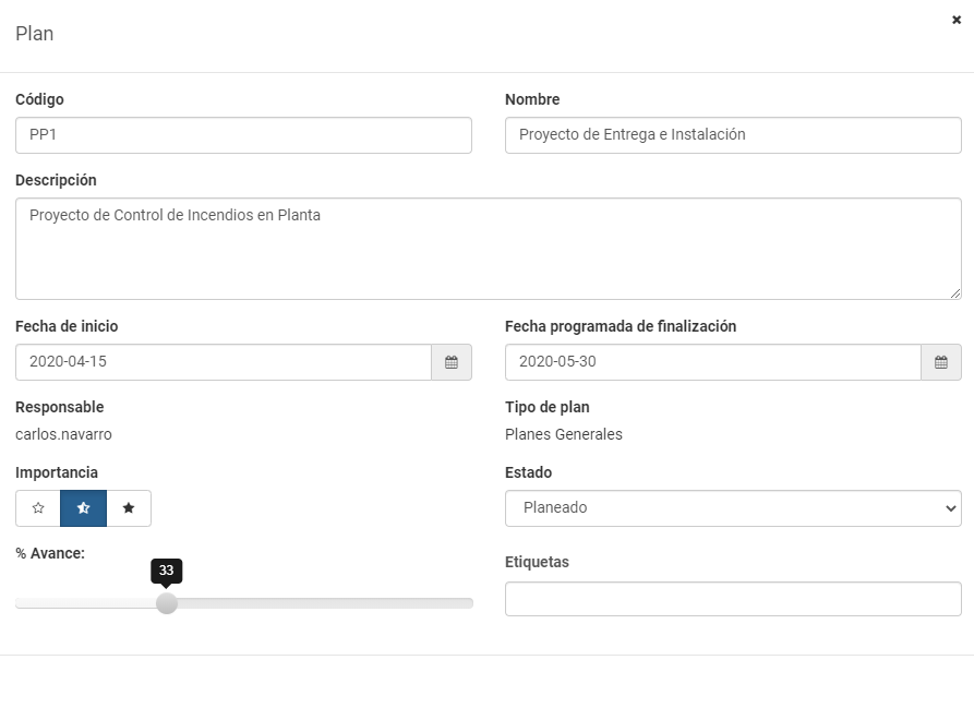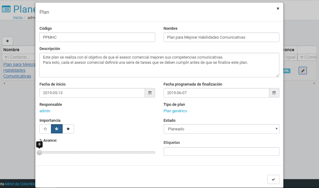 Se diligencian los campos: nombre (correspondiente al nombre de la tarea), responsable (usuario quién realizar la tarea), importancia (indica el peso ponderado de la tarea, frente al plan), descripción (explicación detallada de la tarea), fecha de inicio y de programación de finalización de la tarea. % avance (indica el progreso en la ejecución de la tarea, este aumenta de manera manual o cuándo se cambia de fase una tarea).