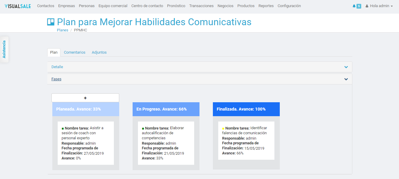 Su principal objetivo es permitir que el usuario de VisualSale pueda crear planes independientes o asociados a otra funcionalidad de VisualSale. Por ejemplo, el usuario podrá asociar un Plan de Trabajo para mejorar una competencia profesional o un plan de trabajo para cumplir una serie de compromisos generados después de ejecutar una visita a un cliente o prospecto. El plan se compone de tareas, la cuales serán asignadas a usuarios de VisualSale.