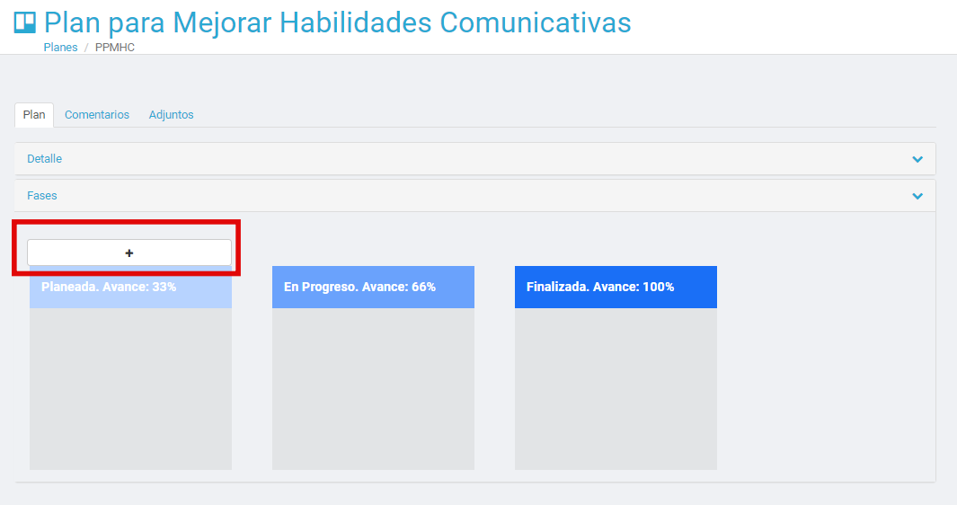 Después de diligenciar los campos de la creación del Plan, usted deberá dar clic en el botón de grabar en la parte inferior derecha de esta pantalla. Una vez realizada esta acción, el Plan queda registrado y luego se visualiza el Kanban del Plan. Esta es una forma visual de mostrar las fases por las cuales deben evolucionar cada una de las tareas que forman parte del Plan (aún no se han registrado). Usted verá una pantalla como la que se muestra a continuación: