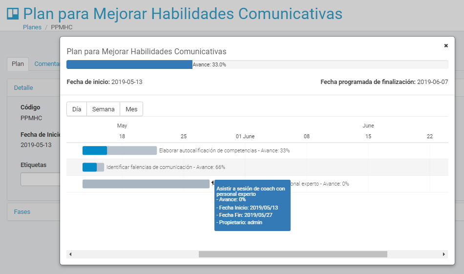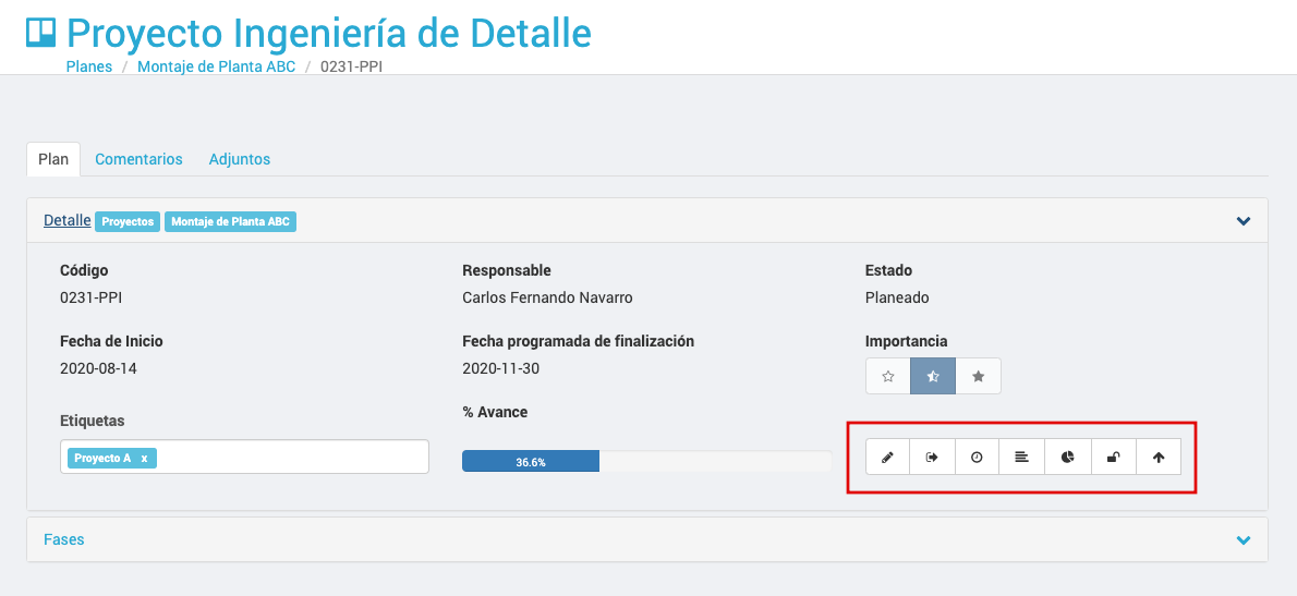 En la pantalla principal del Plan podemos acceder a una sección llamada Detalle. En esta sección encontramos los datos generales del Plan y varios elementos para realizar consultas y mantenimiento del Plan. Estos siete elementos son: la edición del plan, creación de una copia con base a ese plan, la Línea del Tiempo, el gráfico de barras Gantt, un reporte de detalle del Plan, control de accesos al Plan y la Modificación de Fecha de Inicio del Plan.
