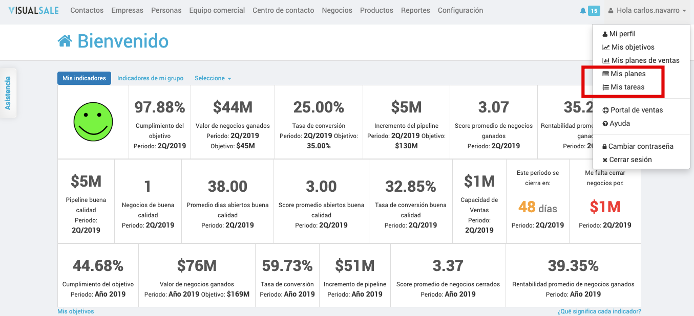 Cuando usted ya tiene creados varios Planes sobre los cuales está trabajando y estos a su vez están compuestos por múltiples Tareas, usted puede consultar de forma sencilla tanto los Planes como las Tareas que tiene pendientes por ejecutar. Para hacer esto usted puede ir a la pantalla de inicio de VisualSale y en el menú complementario del sistema (el menú que se despliega al hacer clic en su nombre de usuario) se podrán ver dos opciones llamadas Mis Planes y Mis Tareas, tal como se ilustra en la siguiente imagen: