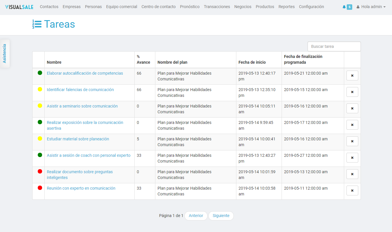Las tareas pendientes se pueden visualizar en un listado, al que se ingresa, haciendo clic en el menú secundario de VisualSale, en la opción: Mis tareas; las tareas aparece organizadas, de manera descendente de acuerdo a la fecha de inicio.