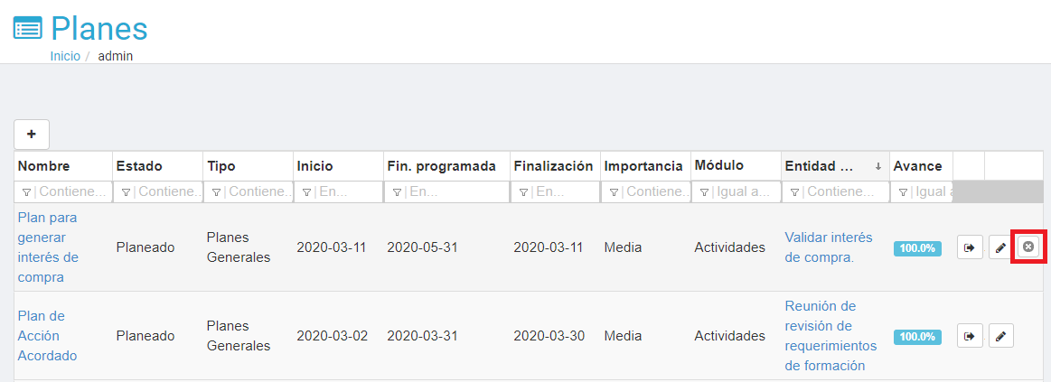 - Estado: Existen tres posibles estados; Planeado, En Progreso y Finalizado. Todo Plan inicialmente queda en estado Planeado.