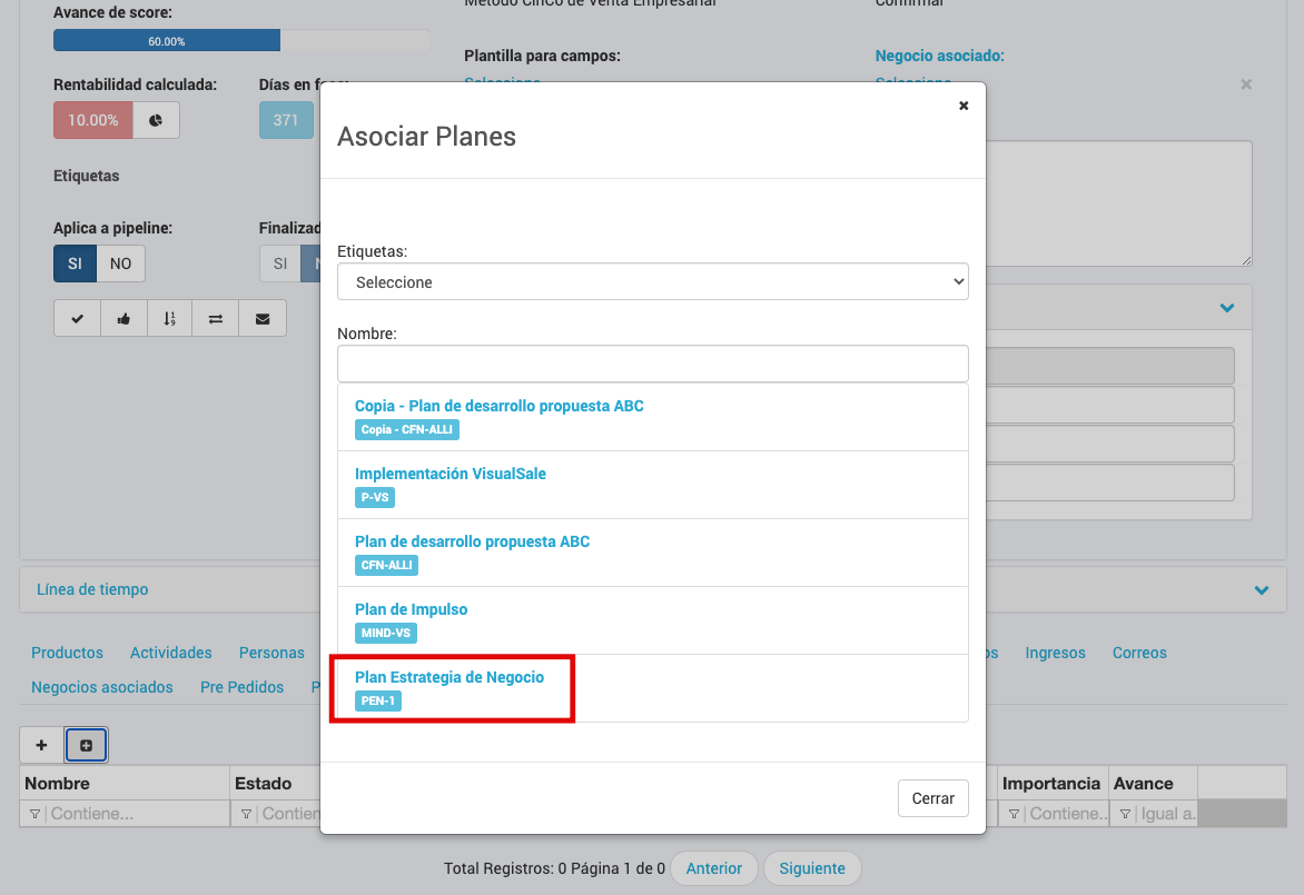 Dentro de VisualSale usted puede crear Planes independientes, es decir, no se encuentran asociados a otras entidades de información de VisualSale. Usted también puede asociar un Plan a entidades como por ejemplo las los Negocios y los Proyectos. Veamos en mayor detalle como realizar la asociación de un Plan a cada una de estas entidades de VisualSale: