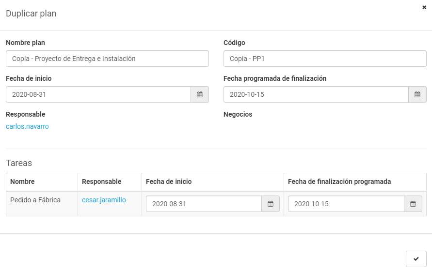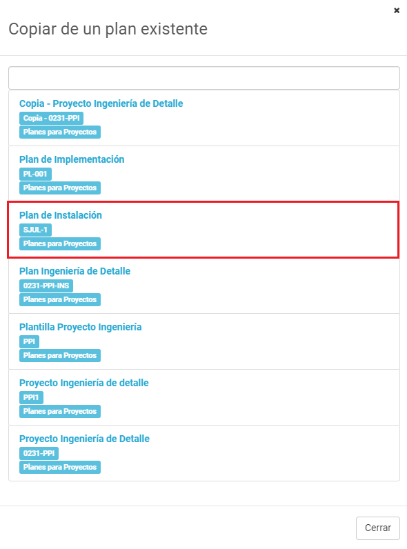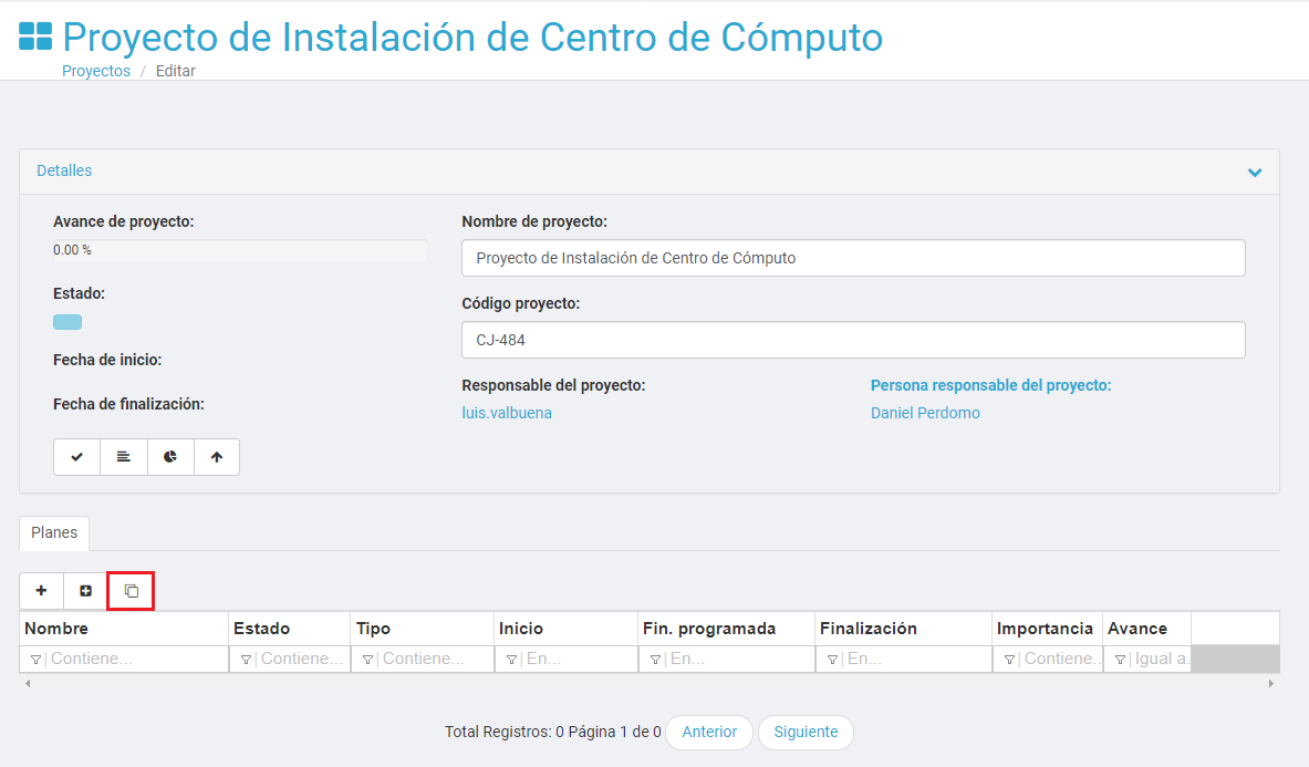 Aquí podremos copiar un plan previamente creado con sus respectivas tareas a un proyecto. Esta funcionalidad se visualiza en el módulo de Proyectos.