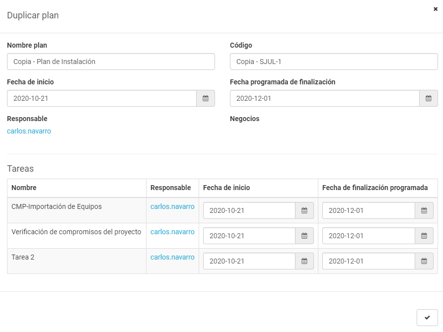 En esta ventana, se observan los planes creados cuyo tipo de plan tiene la etiqueta Proyecto. Seleccionamos el plan que queremos copiar e inmediatamente el sistema nos mostrará una ventana como la que se visualiza a continuación. Allí vemos las tareas que tiene el plan. En esta pantalla podemos renombrar el plan, modificar la fecha de inicio, la fecha programada de finalización, cambiar el responsable del plan, modificar el responsable de las tareas y modificar las fechas de las tareas existentes.