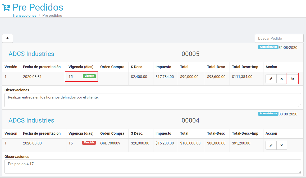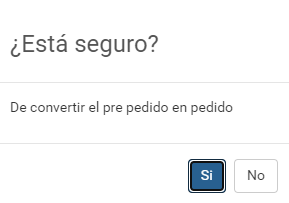 Para convertir un pre pedido en pedido, vaya a listado de pre pedidos y haga clic en el botón de convertir en pedido.