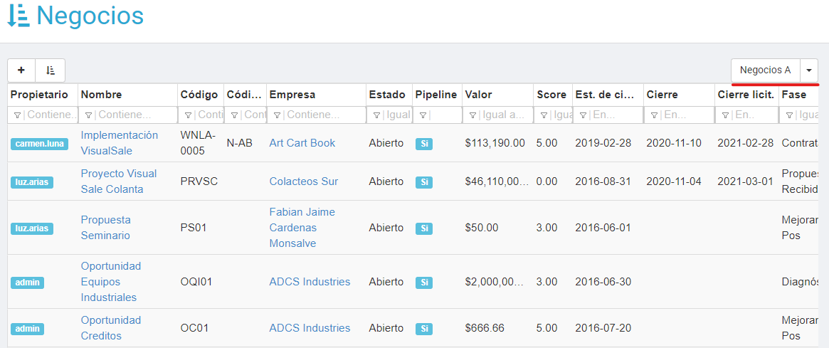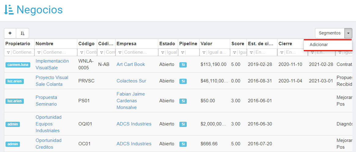 A través del uso de la funcionalidad de Segmentos se pueden crear grupos de Negocios que reúnen características similares. Es muy útil cuando se requiere identificar uno o varios negocios que cumplan con una o varias características, las cuales son identificables por la información registrada en los campos de NEgocios. Igualmente. También se puede utilizar para realizar la exportación en el formato CSV (Comma Separated Value) que puede ser luego llevado a una herramienta como Excel. Esta opción estará habilitada por el esquema de seguridad de VisualSale. así que pueda que no esté disponible para todos los usuarios.