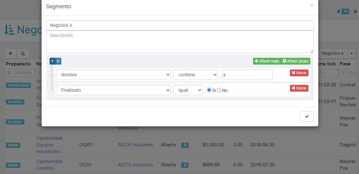 Se abrirá una ventana como la que se muestra a continuación en la cual usted puede establecer las condiciones para construir el Segmento de Negocios.