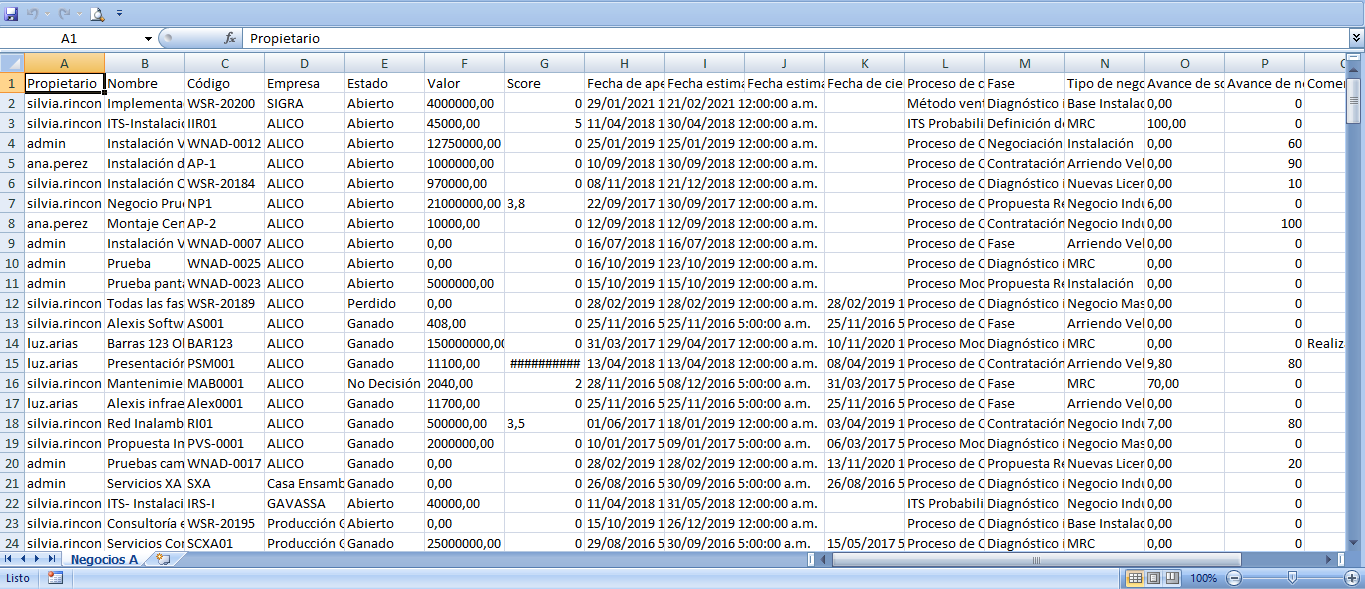 Una vez que hace uso de la opción de exportación, usted podrá abrir el archivo en Excel o en otra aplicación que permita abrir archivos en formato CSV. Verá la información como en el ejemplo que aparece a continuación: