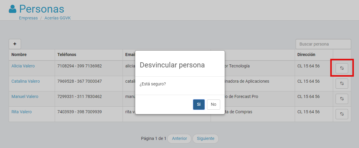 En la parte derecha de esta pantalla aparece un botón que permite realizar el proceso de desvinculación de la Persona a la Empresa. Una vez que usted da clic en ese botón (aparece en un recuadro rojo en la anterior imagen), se muestra una ventana de confirmación de la desvinculación. Una vez que la persona ha sido desvinculada, aparecerá con una etiqueta de color rojo, indicando que está persona se encuentra desvinculada de la empresa. Se muestra una imagen de ejemplo a continuación:
