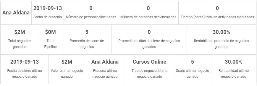Resumen: Esta opción permite visualizar un resumen de la gestión realizada con la Persona (fecha de creación, número de personas vinculadas, desvinculadas, tiempo en horas de actividades ejecutadas, información de última activad ejecutada, valor de negocio; ganados, en pipeline, promedio de: score, rentabilidad, de días de cierre de negocios ganados y gráficas de; incremento de pipeline (cantidad, valor), negocios ganados por tipo (cantidad, valor), actividades por categoría (horas, cantidad) y top 10 de productos más comprados ).(aplica para personas independientes).