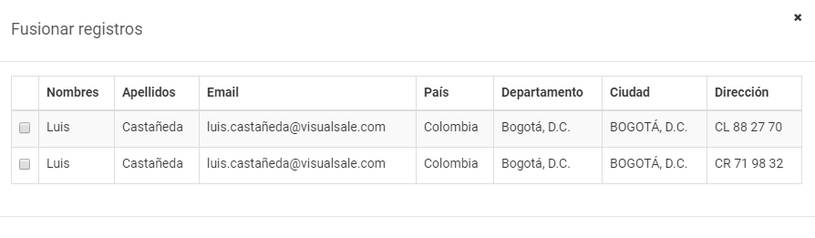 Al hacer clic en el botón de fusionar VisualSale, buscará posibles coincidencias entre empresas, en caso de que existan se visualizará un listado de personas similares.