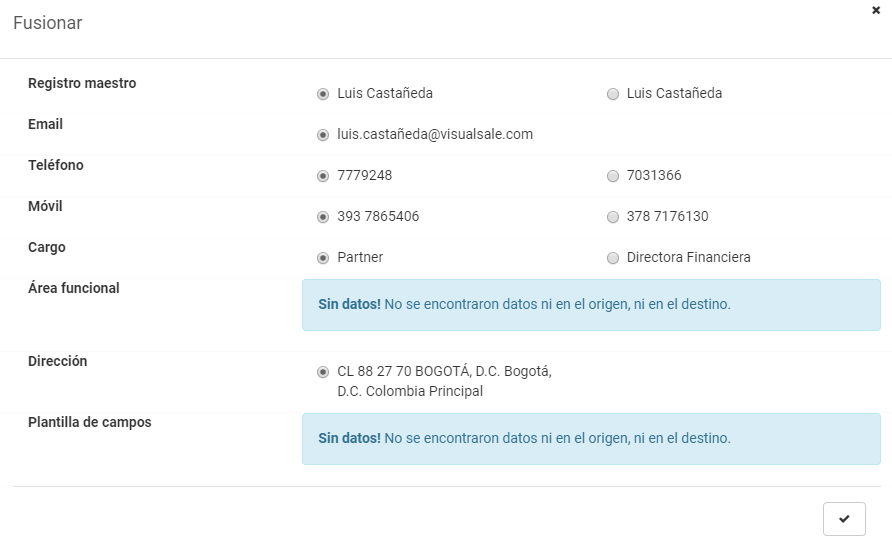 Al realizar esta operación, aparecerá una pantalla en donde se deben elegir los registros que prevalecerán de las dos empresas y hacer clic en el botón: