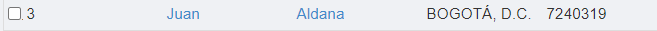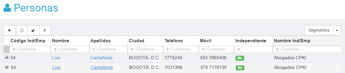 Haciendo uso de los campos que se encuentra en los encabezados de esta tabla, usted podrá realizar búsquedas y filtros en la tabla de Personas. Debajo de cada uno de los títulos de los encabezados de las columnas de la tabla, usted podrá encontrar unos espacios en blanco. Allí podrá digitar la información que busca y el sistema automáticamente comienza a ejecutar la búsqueda. Puede aplicar una búsqueda compuesta (Y) diligenciando información en las diferentes columnas. Para borrar los resultados de la búsqueda, simplemente borre la información digitada en cada una de las columnas o refresque su browser.