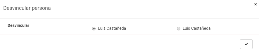 En caso de hacer clic en el botón fusionar entre una persona independiente y una vinculada a una empresa, aparece una pantalla para desvincular la persona asociada a la empresa,