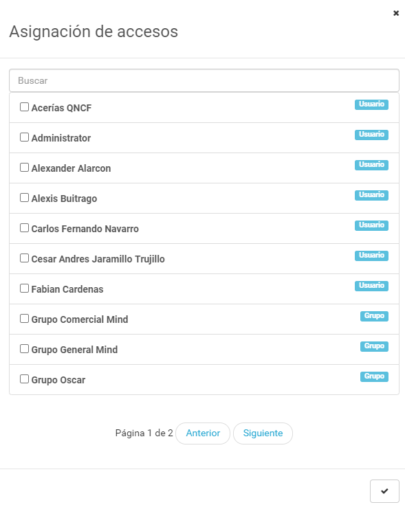 Se puede realizar una asignación masiva de accesos, seleccionando las personas a asignar, para lo cual se puede hacer clic en cada control de chequeo que se encuentra la inicio de cada fila del listado o haciendo clic en el control de chequeo que se encuentra en la parte superior de la lista (esta opción seleccionará todas las personas que se están visualizando en el listado), una vez seleccionadas las personas se hace clic en el botón de accesos: