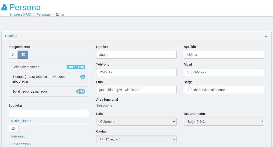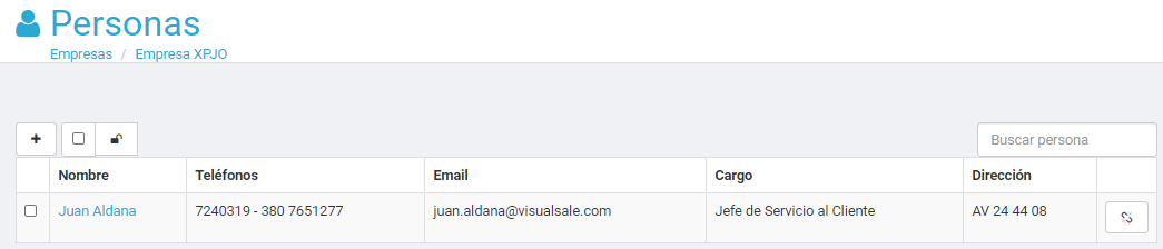 El concepto de Persona dentro de VisualSale corresponde a individuos que pueden estar vinculados a una Empresa, en cuyo caso se entiende que esa persona es un funcionario que labora para esa Empresa o pueden ser Personas independientes, es decir no están vinculados a una Empresa y se pueden realizar gestiones dentro de VisualSale tomando a esa persona como un Lead, Prospecto o Cliente. El objetivo principal de esta funcionalidad es que el usuario cuente con la información necesaria de la Persona en VisualSale, para llevar a cabo su gestión de forma efectiva.