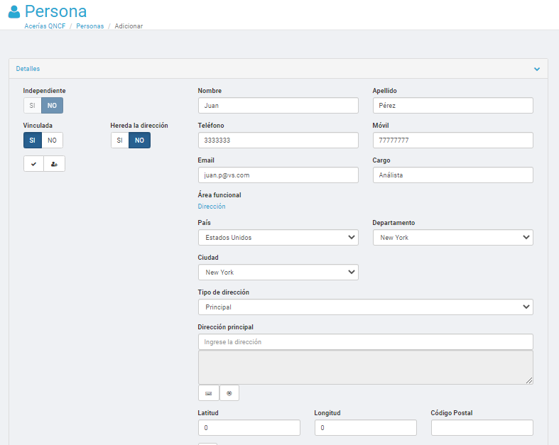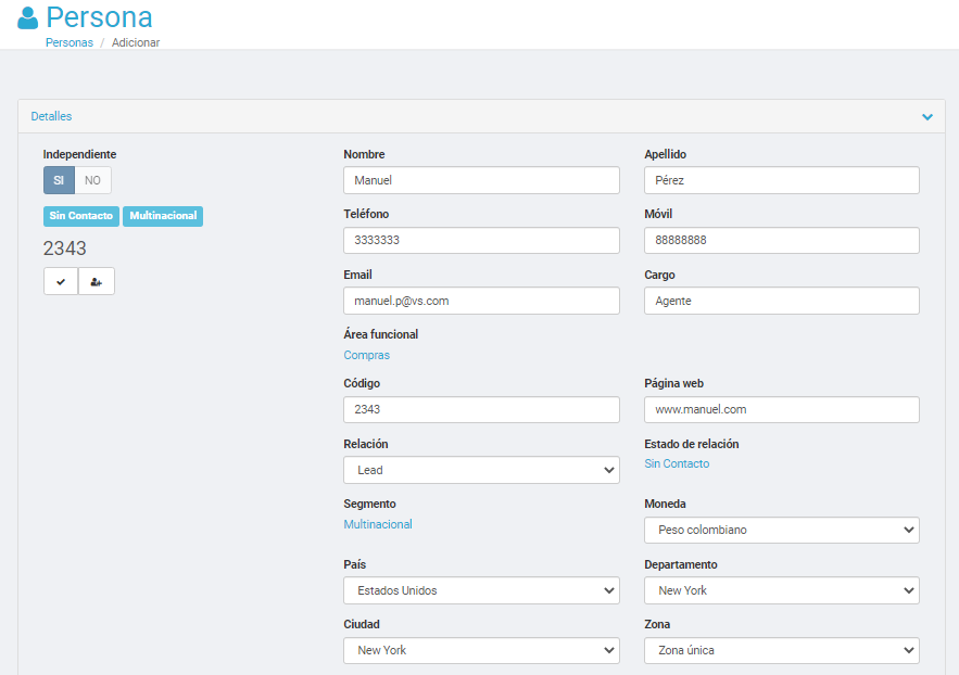 - El campo Independiente se utiliza para indicar si la Persona no está vinculada a ninguna Empresa. Este campo se encuentra deshabilitado y por defecto solamente permite crear, por esta opción, Personas Independientes.