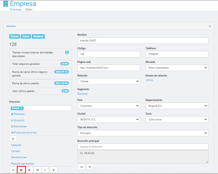 Si usted desea crear una Persona asociada a una Empresa, debe ingresar por la Empresa y seleccionar la opción de Adicionar Persona (ícono resaltado en la imagen) como se muestra en la siguiente imagen:
