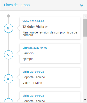 El objetivo principal de esta visualización de la información es poder mostrar al usuario todas las acciones ordenadas cronológicamente (de la más reciente a la más antigua) que se han ejecutado dentro de VisualSale con esta Empresa. Cada una de las cajas que se encuentran en la pantalla representan una acción que puede ser, desde la creación de la Empresa en el sistema, pasando por actividades programadas o ejecutadas, pedidos, negocios, etc. Dando clic en cada una de las cajas que representan las acciones, usted podrá ver el detalle de esa acción.