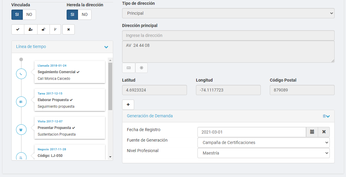 - En el campo Dirección principal, creé la dirección de la Persona, dando clic en el icono, Por ejemplo, CL 93B 17 42, AV 68 5 43, etc. Es obligatorio. Ver direcciones.
