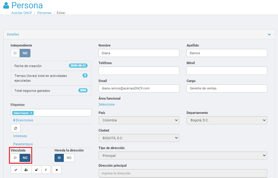 Cuando usted marca como Vinculada NO, la Persona pasa a estar desvinculada de la Empresa.