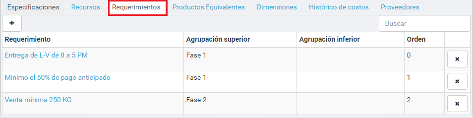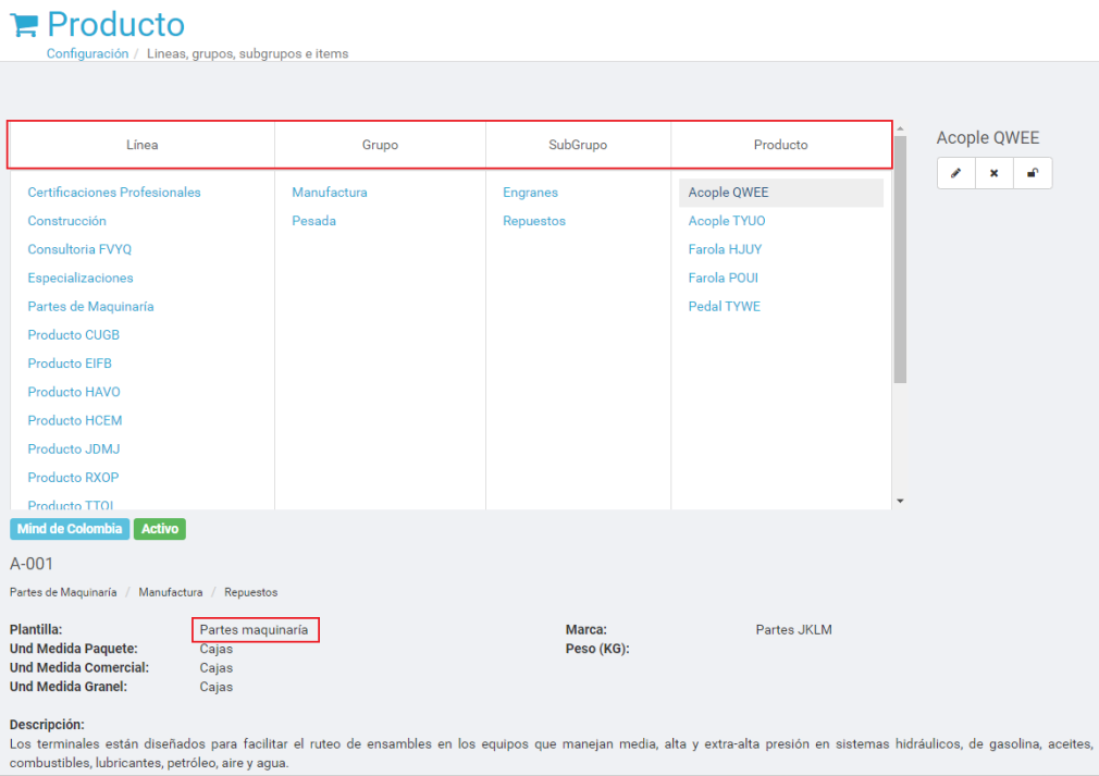 En el recuadro rojo superior se encuentran los encabezados de la jerarquía (línea, grupo y subgrupo). En el recuadro rojo inferior se encuentra la Plantilla de especificaciones que se usa en el producto.
