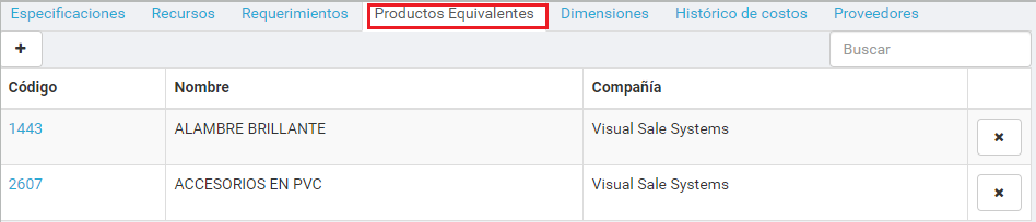 En el recuadro rojo superior se encuentra el encabezado de los productos equivalentes. Y abajo el listado de los diferentes productos equivalentes, al producto seleccionado.