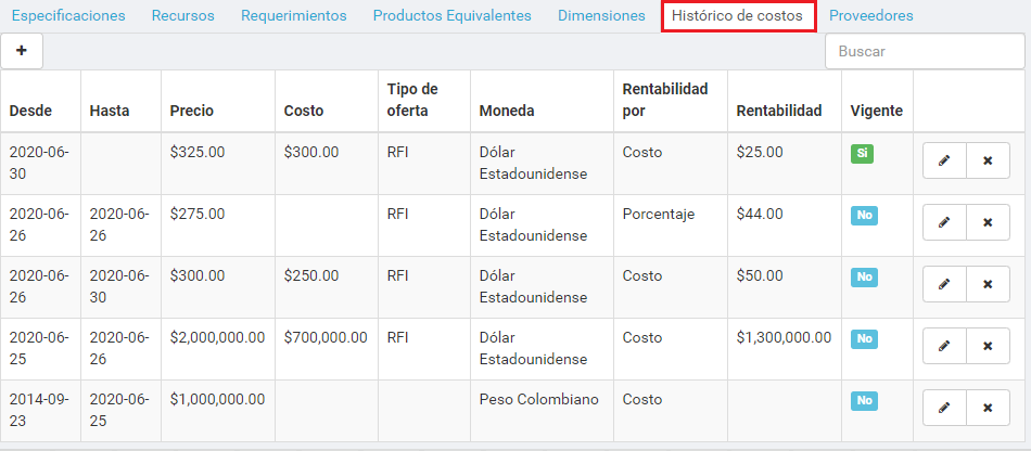 En el recuadro rojo superior se encuentra el encabezado de Histórico de costos y precios. Y abajo el listado de los diferentes precios y costos definidos en el producto.
